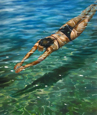 According to the artist "My work is about psychological turning points and transformations and risk, taking that proverbial leap of faith, balanced with that quest for finding refuge, finding quietness and stillness and escapism," he said. "Some [paintings] are very, very introspective escapism. Some are just the joy, the pool full of people in this temporary oasis. The 10 minutes when you hit the water for the first time and the smell of sun tan lotion hits your nose. You really don't think about anything for those first few minutes."